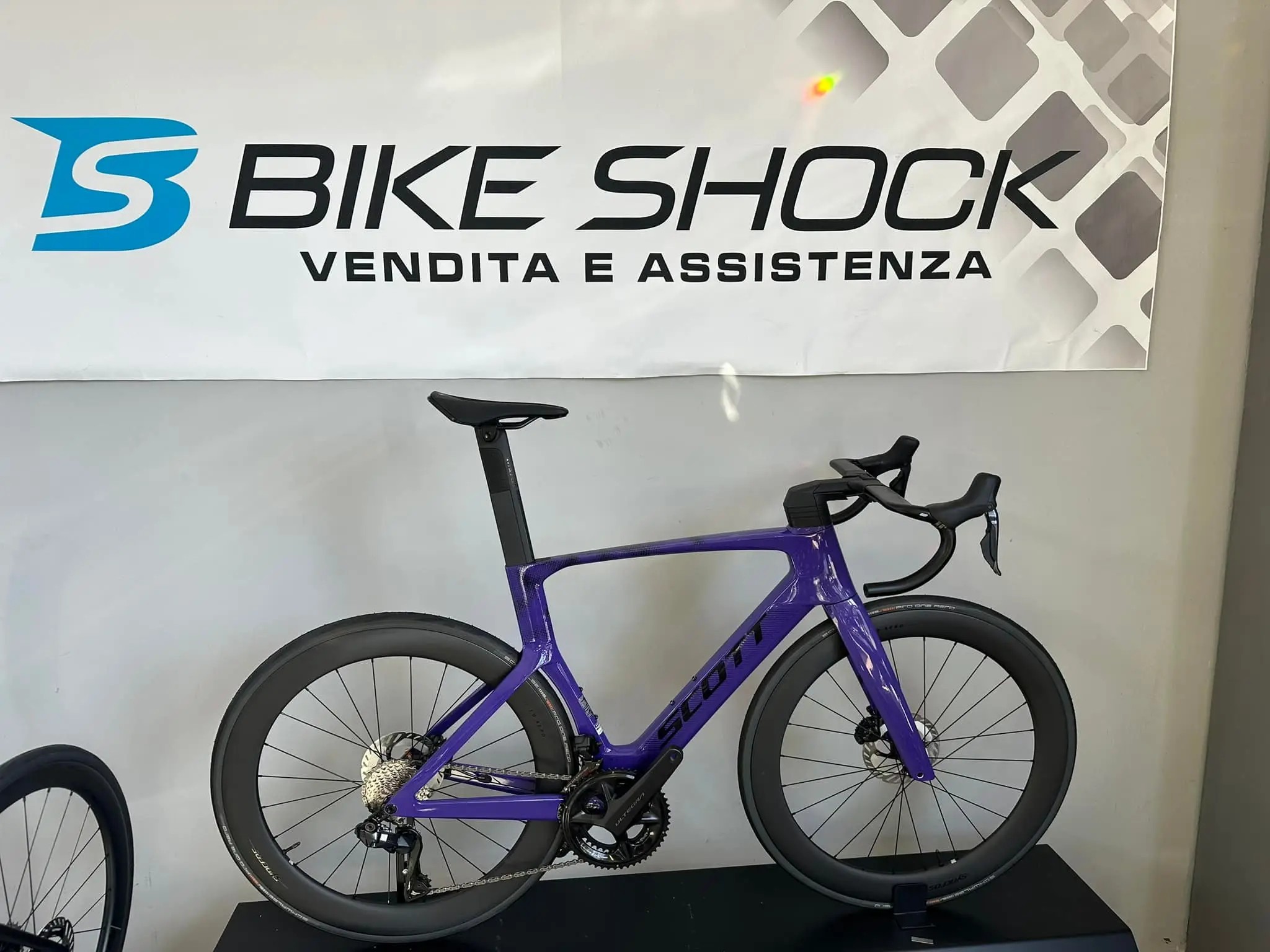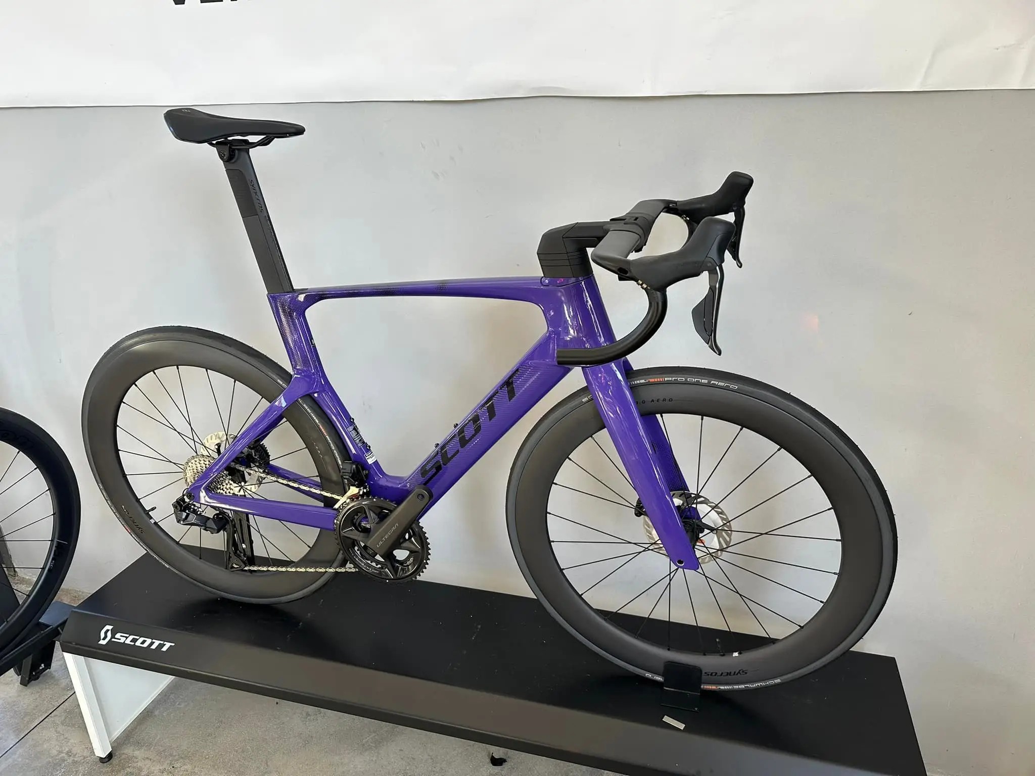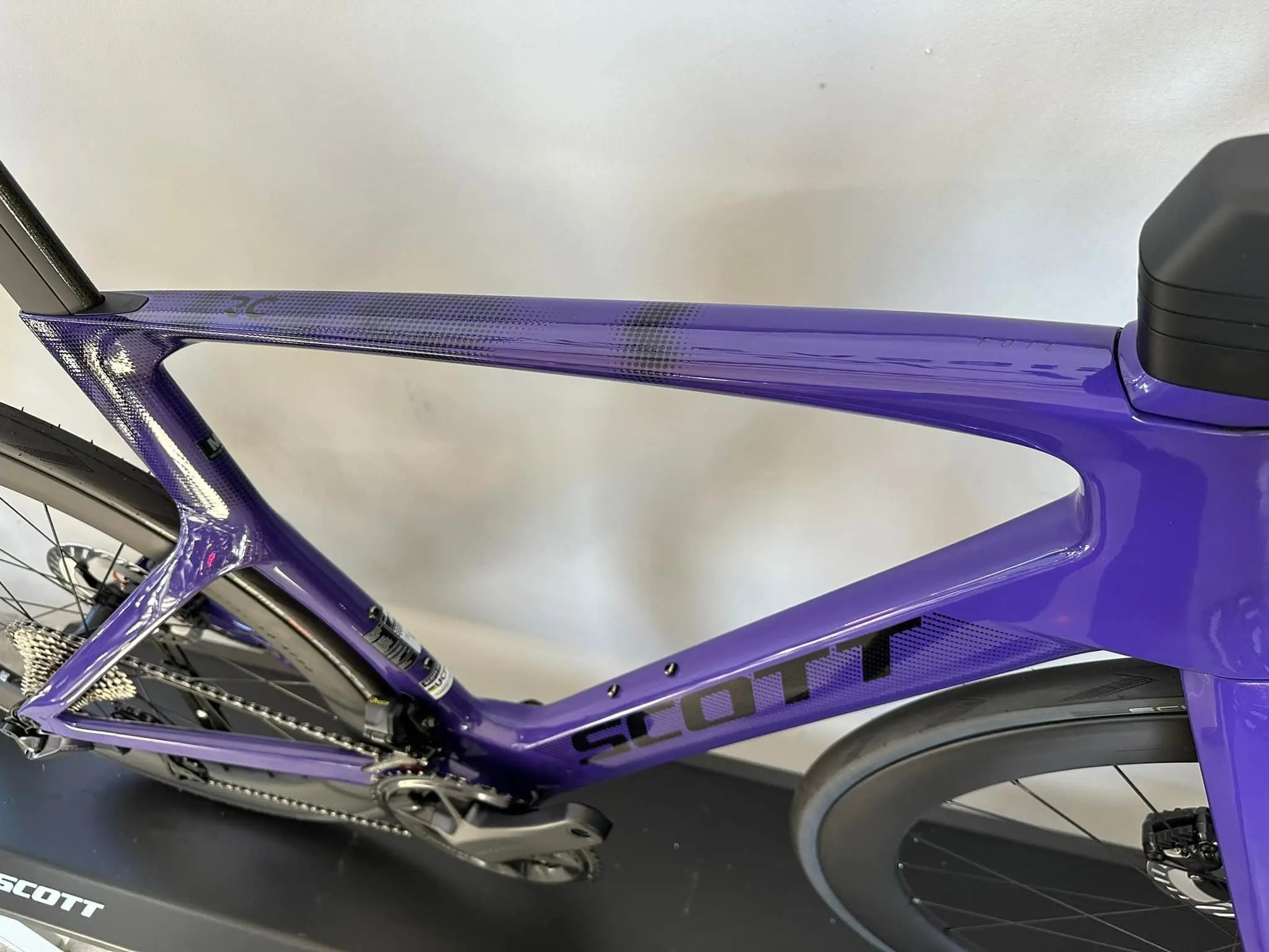 La Scott Foil RC 10 viola è una bicicletta da strada ad alte prestazioni, progettata per eccellere nelle competizioni e nelle lunghe uscite.
